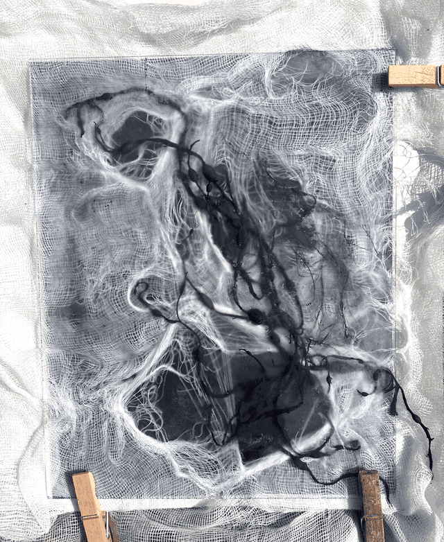 my favourite print I made was a cyanotype that i fixed on expired photo paper. I didn't paint the edges and the warm coloured paper captured a pinkish lumen print of the cheesecloth.