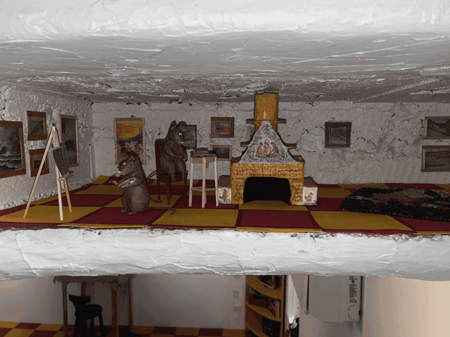 the mice have arrived! I've been working on building this mouse house at work for Mabel and Charlie mouse, made by Rion Microys. I made everything except the mice and Orion made the mini artworks. We will try to make little lamps for in there, apologies for the scary flash.